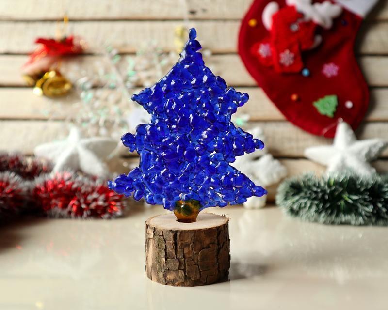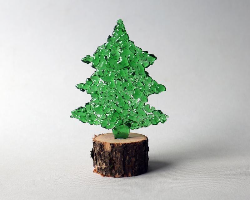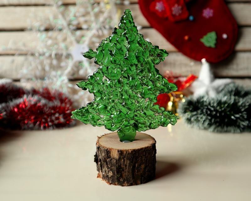 Оригінальні, скляні ялинки - подарунки на Новий рік та Різдво. Прикраса святкового стола. Висота – 15 см. Ширина – 10 см. Підставка – натуральний спил дерева.
