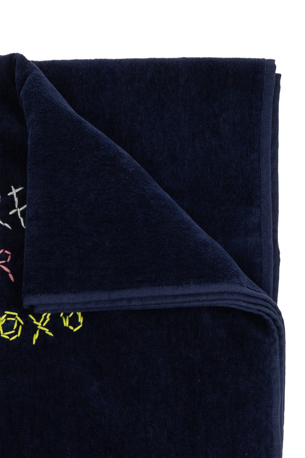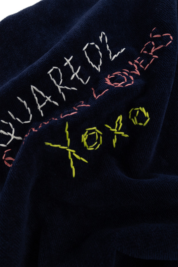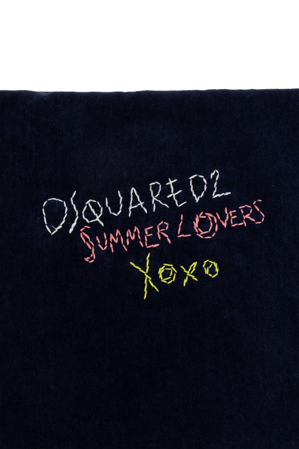 Introducing the Ręcznik z logo from the exclusive collection by Dsquared2, a brand synonymous with avant-garde luxury. This opulent navy towel, crafted from the finest cotton, exudes sophistication and unparalleled softness, ensuring a touch of elegance in your everyday life. Adorned with distinctive embroidery in vibrant hues of white, pink, and yellow, the towel prominently features the phrases \"DSQUARED2\", \"Summer Lovers\", and \"Xoxo\". These intricate designs create a striking contrast against the deep, rich background, epitomizing the unique artistic flair of designers Dan and Dean Caten. Why Choose This Product? Crafted from luxurious, high-quality cotton for ultimate softness. Exclusive design featuring bold, colorful embroidery. Perfect blend of American glamour and Italian chic. Versatile accessory for an elevated lifestyle.