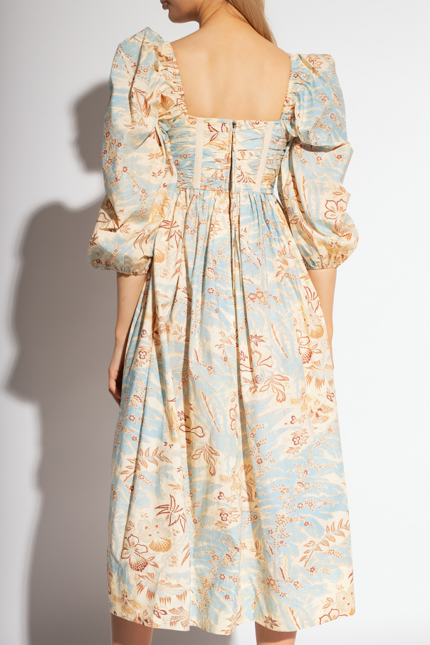 Multicolored ‘Leilani’ dress from Ulla Johnson. Crafted from cotton, this flared design features a back zip and hook fastening, a print, square neck, long puff sleeves and side pockets.