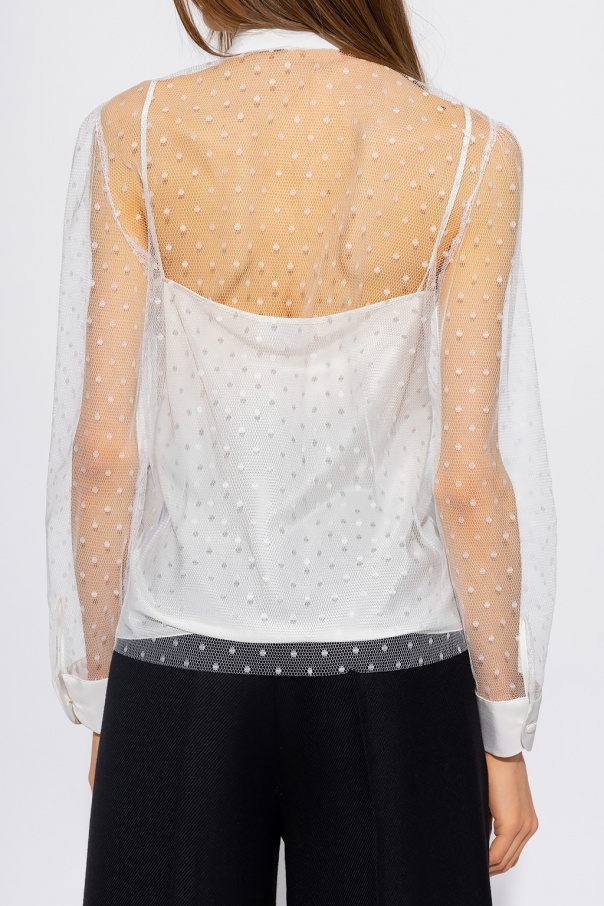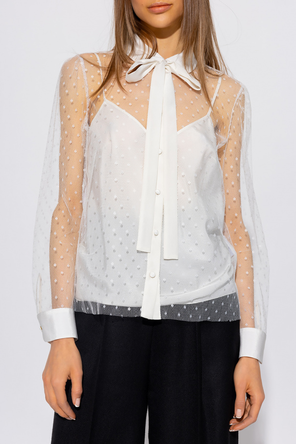 White, transparent shirt from Red Valentino. Crafted from tulle with the label’s signature ‘Point d’Esprit’ pattern, this garment features button fastenings, neckline with a removable tie and long sleeves with button cuffs. Comes with a black slip top.