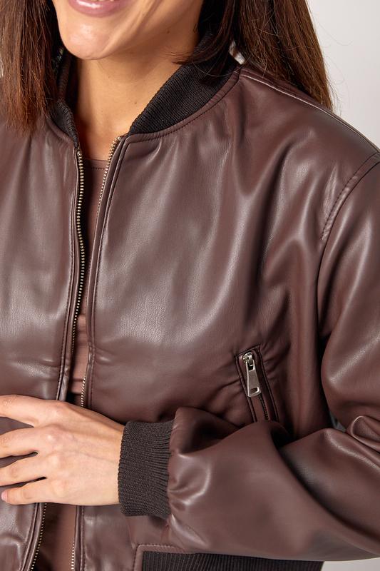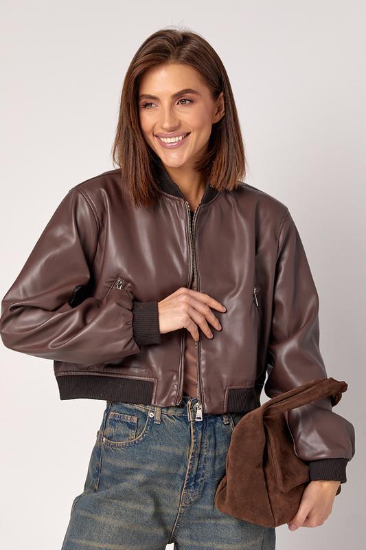 Кольори: світло-коричневий, коричневийБомбер пошитий зі шкірозамінника і доповнений тонкою гладкою підкладкою без утеплювача, спереду застібається на блискавку. Прямий низ та довгі рукави доповнені манжетами із трикотажу в рубчик. Також у бомбері є невеликий комірець-стійка. Спереду внизу розташовані кишені з блискавками.
