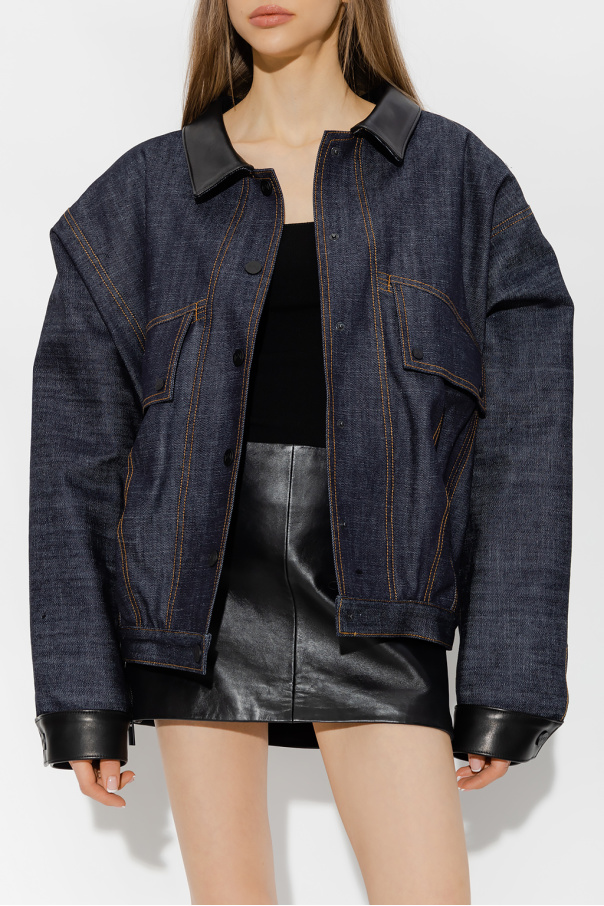 Navy blue ‘Lio’ denim jacket from The Mannei. Cut with an oversize fit, this style features black snap closures with a logo, beige stitching details, four pockets on the front – two with snap-fastened flaps, and long sleeves with snap-fastened cuffs.