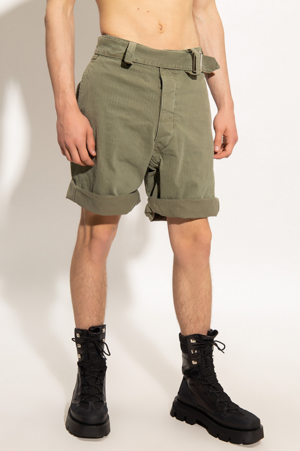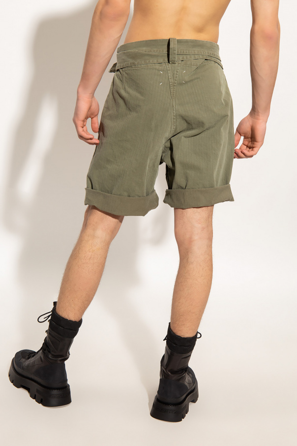 Green shorts from Maison Margiela. Crafted from cotton, this pair features a hook and buttons, buckle belt, the label’s signature stitching details in white, two front pockets and turn up cuffs.