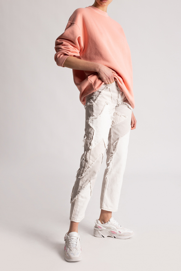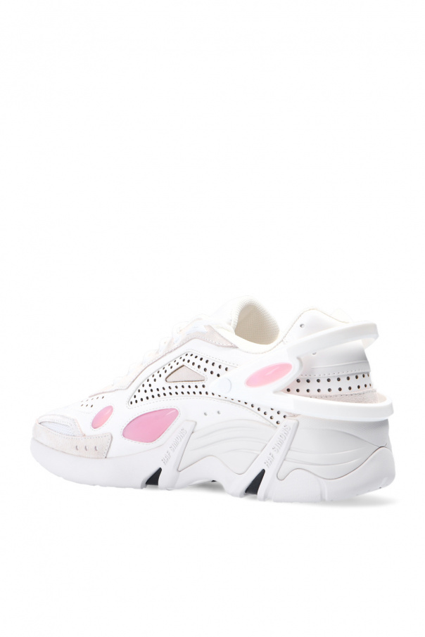 White and pink ‘Cylon-21’ lace-up sneakers from Raf Simons. Crafted from perforated leather with rubber trims, this design features a logo print, removable appliqués and a rubber sole in white and black.