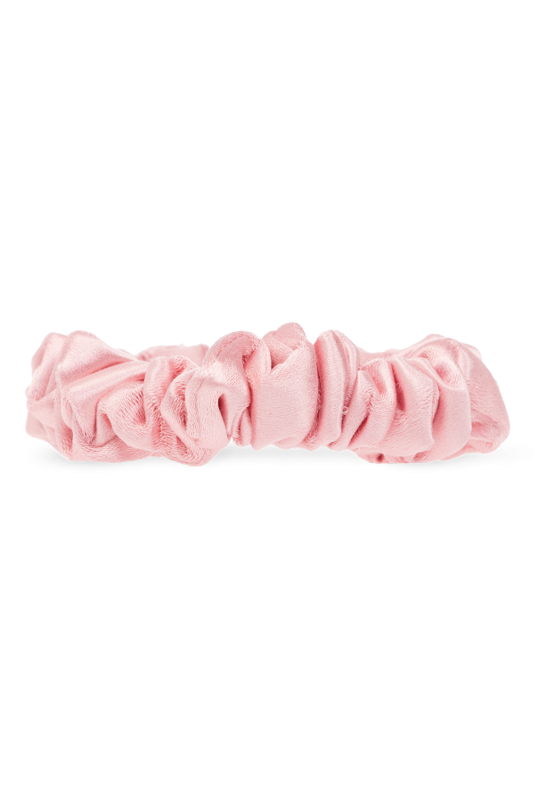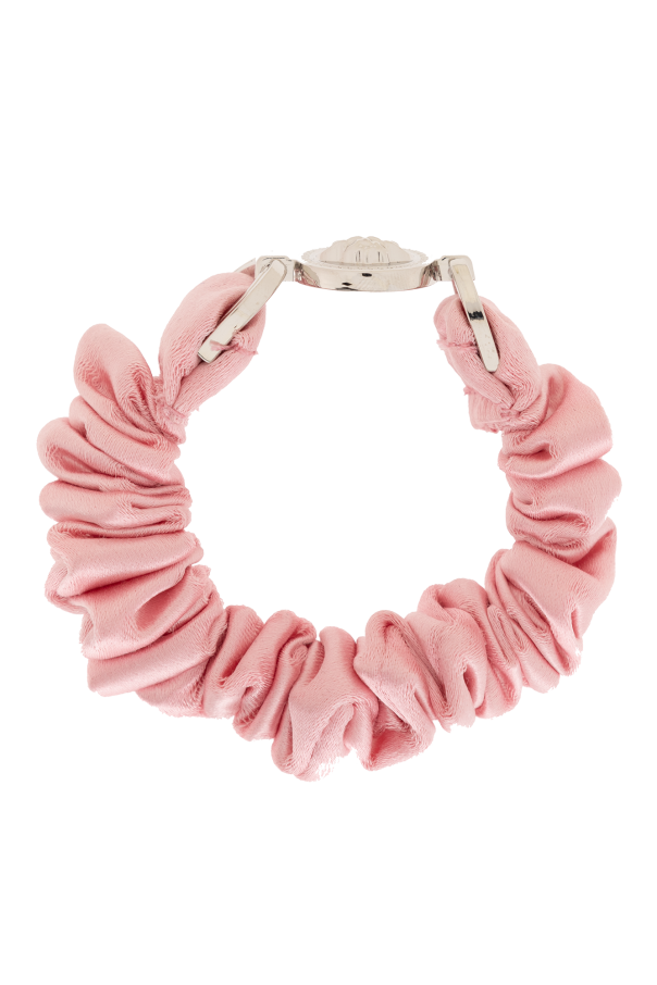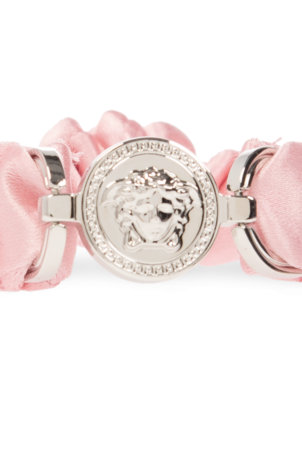 Light pink scrunchie from Versace. Made of satin, this item showcases a silver-tone application with the brand\'s signature Medusa face.