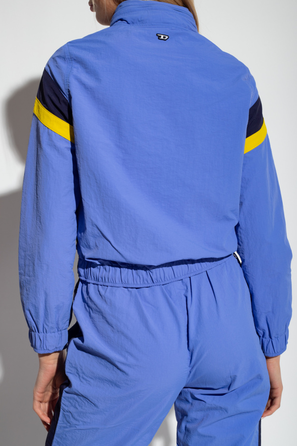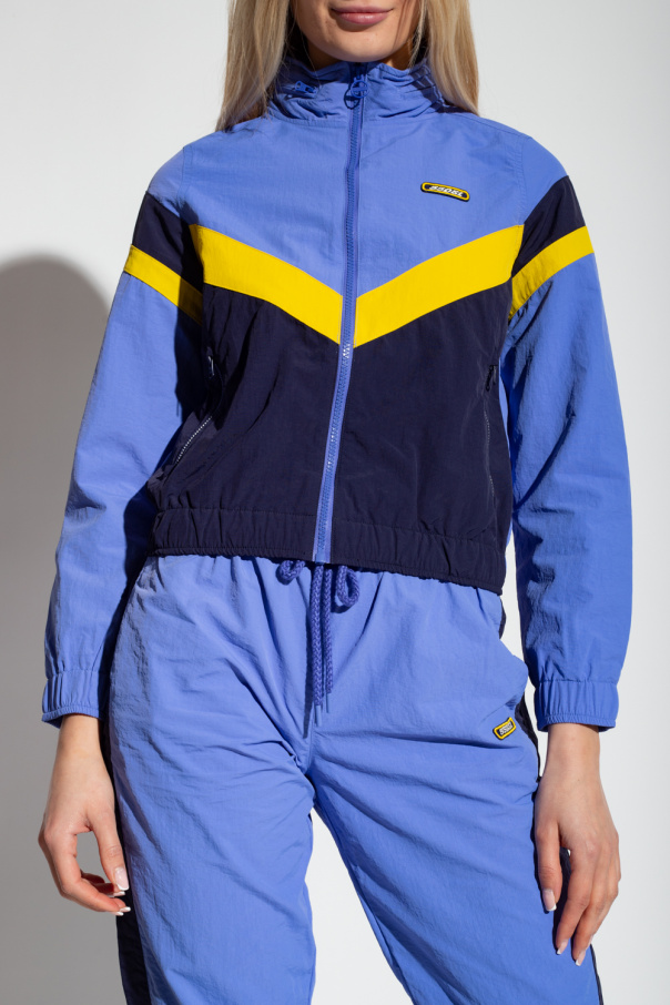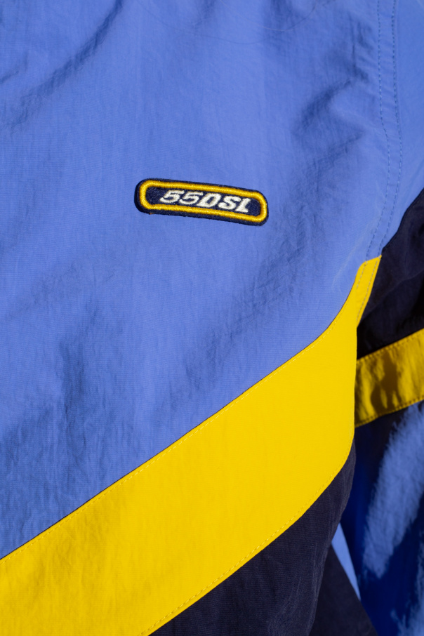 Blue, yellow and navy blue ‘AWWT-SWIFTOR-HT24’ jacket from Diesel, the ‘DIESEL SPORT’ collection. Emblazoned with patches and asymmetrical topstitching, this style features a zip fastening, a hood in the collar, two zip pockets and elasticized trims on the bottom hem and cuffs.