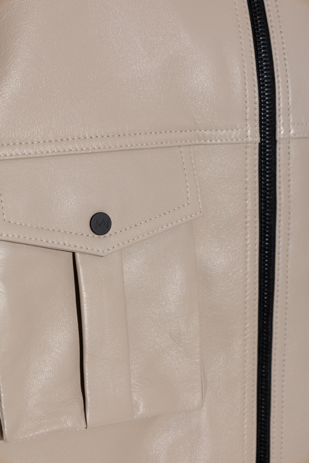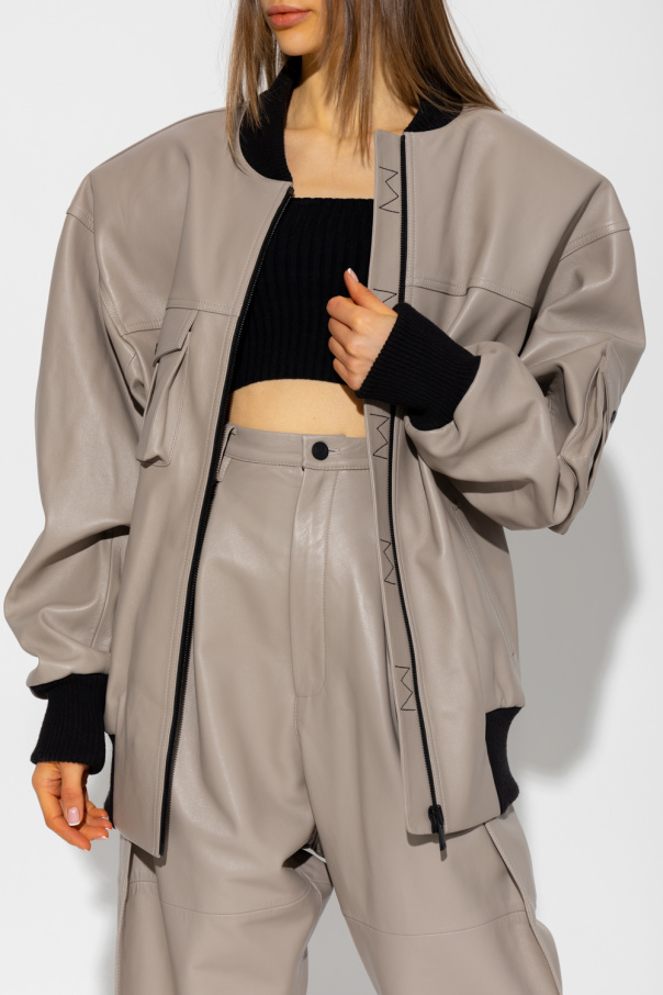 Greyish brown bomber jacket from The Mannei. Made of leather, this garment features a zip fastenings, oversize design, two slip pockets, two snap-fastened pockets and black ribbed trims at the collar, hem and cuffs.