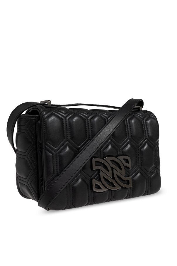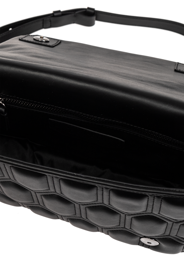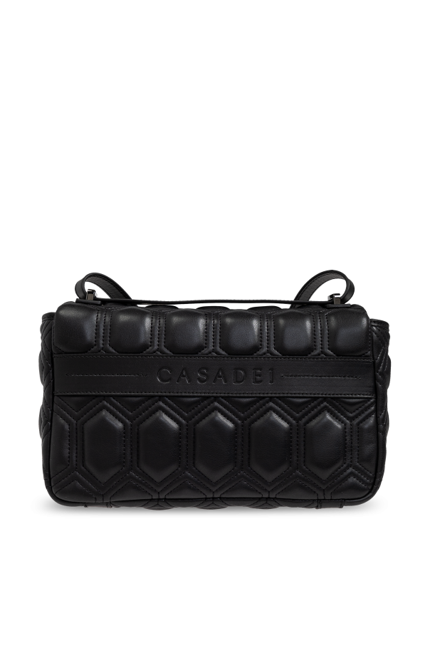 Presenting an exclusive shoulder bag designed by the renowned Casadei. This elegant and contemporary piece combines sophistication with practicality, making it an impeccable choice for the discerning individual. Crafted from luxurious black leather, the bag boasts a distinctive rectangular shape and generous dimensions, perfect for shoulder wear. The exterior is adorned with a unique hexagonal quilted pattern, exuding modern elegance. On the front, a prominent metal logo featuring interlocking letters adds a touch of opulence, while the back showcases the embossed \"CASADEI\" signature. The adjustable leather strap ensures a perfect fit for every occasion. The interior is lined with high-quality fabric and includes a zippered pocket, enhancing the bag\'s functionality. Additionally, a magnetic clasp secures your essentials with ease and style. Why Choose This Product? Exquisite black leather construction Unique hexagonal quilted pattern Prominent metal logo and embossed signature Adjustable leather strap for versatile wear Functional interior with a zippered pocket
