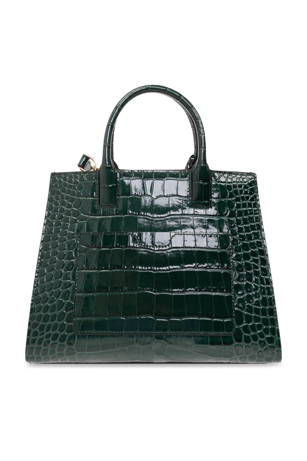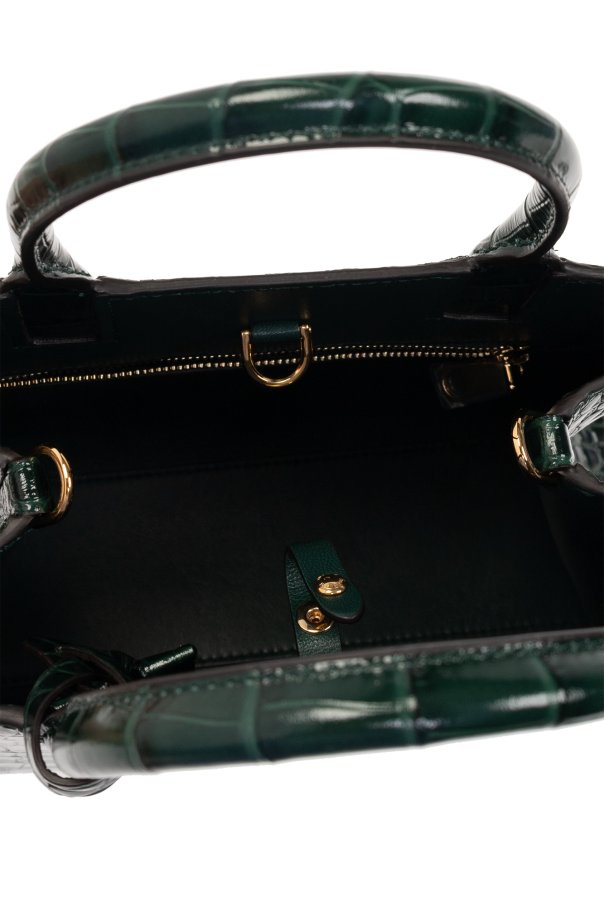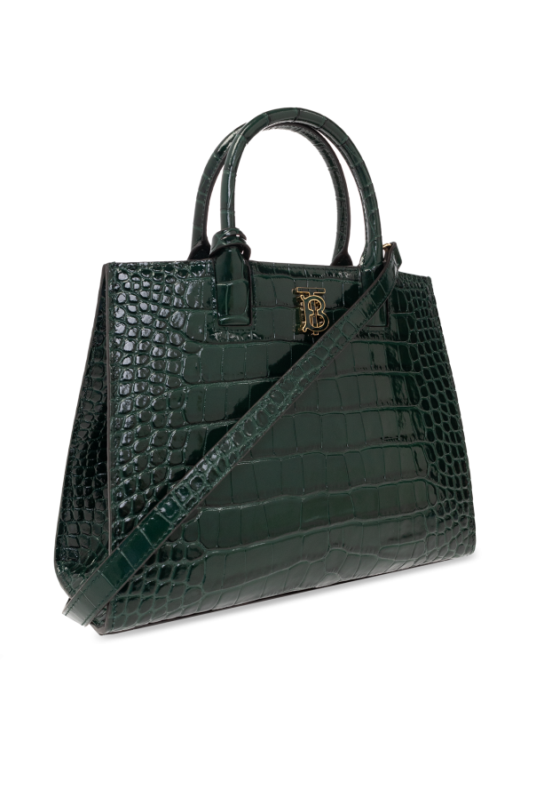 Dark green ‘Frances Mini’ shoulder bag from Burberry. Crafted from faux leather with a crocodile skin effect, this model features snap buttons, magnetic snaps on the sides to adjust the size, back pocket, removable keyring, two half-round handles, adjustable shoulder strap, gold-tone metal hardware and one internal compartment with one slip pocket and one zip pocket.