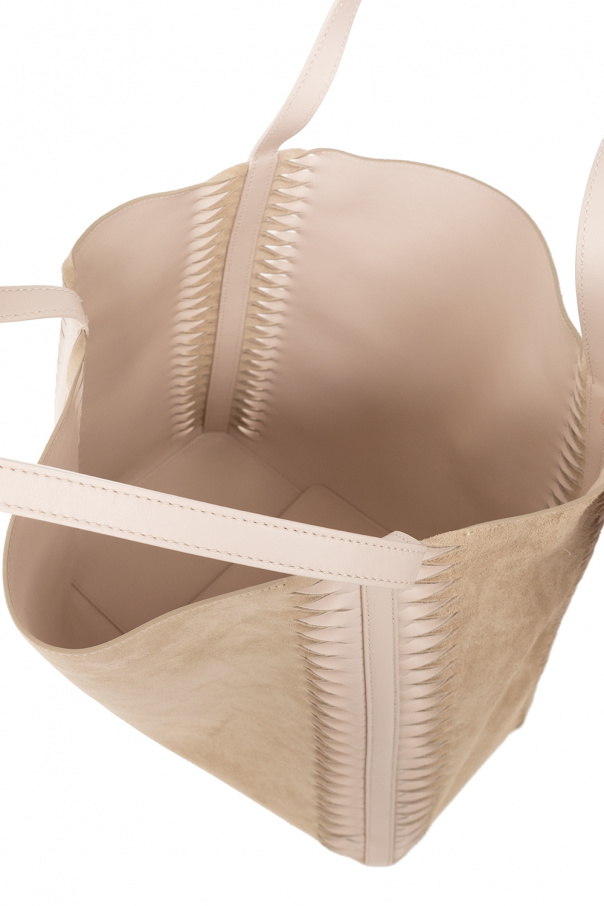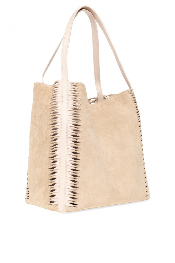 Cream ‘Louela’ shopper bag from Chloé. Made of calf suede, this model features an embossed logo, decorative woven sides, two handles and one internal compartment with a detachable zipped pouch.