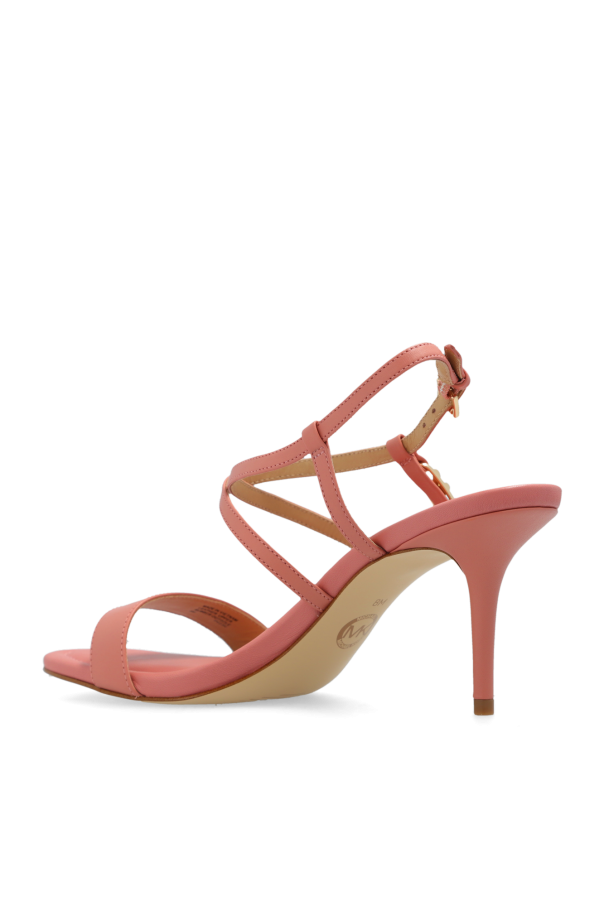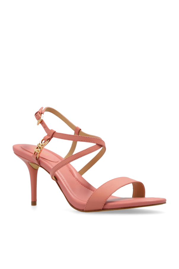 Pink heeled sandals from Michael Michael Kors. Made of leather, this pair features a buckled ankle strap and beige rubber sole.