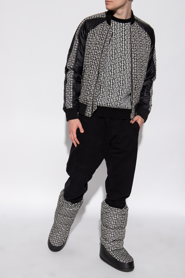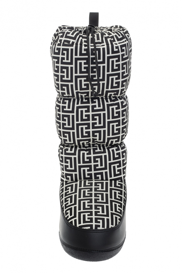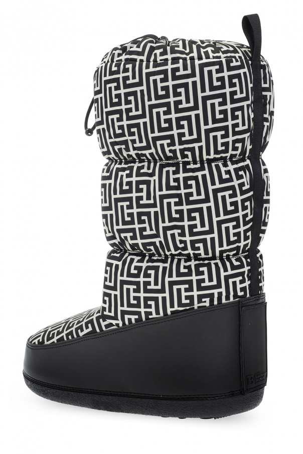 Black and white snow boots from Balmain. Enriched by a logo graphic, this model features a drawstring fastening and a black rubber sole.