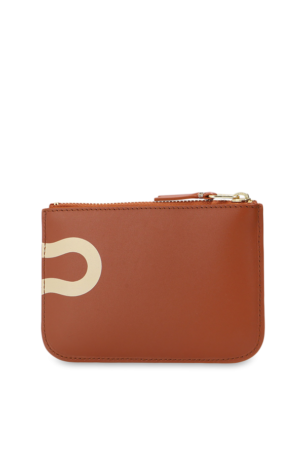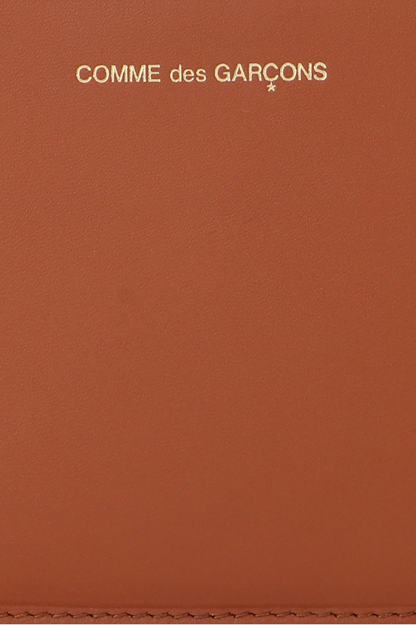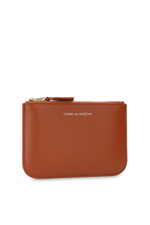 Brown wallet from Comme des Garçons. Made of leather, this item features an embossed logo pattern in gold-tone, zip fastening, one internal compartment and gold-tone metal hardware.