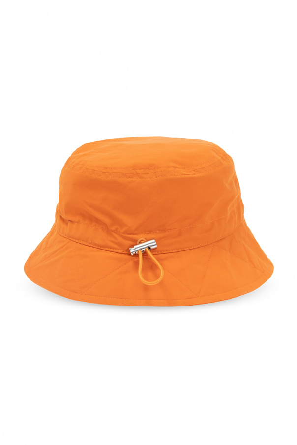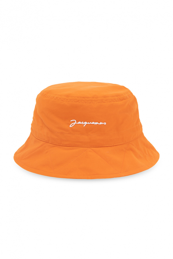 Orange hat from Jacquemus. Fastened with drawstrings, this design is decorated with a white logo embroidery.