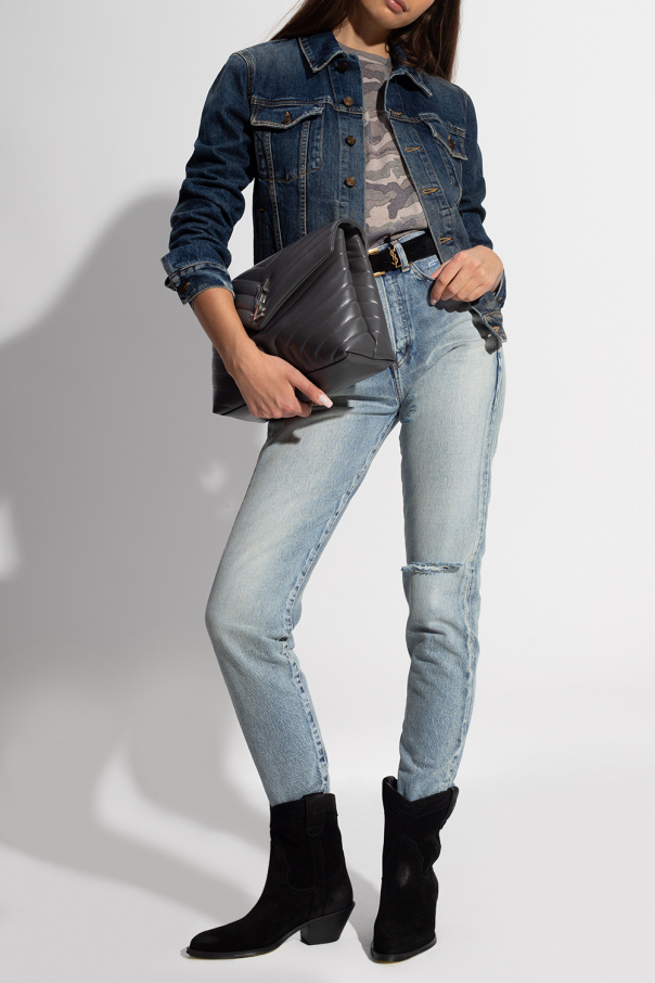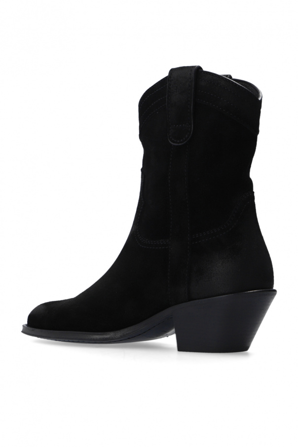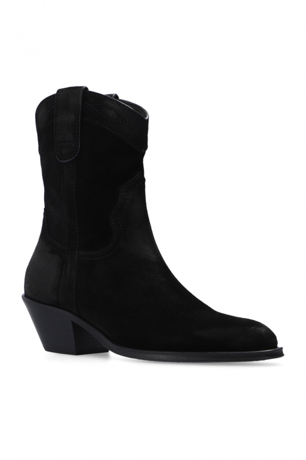Black ‘Eastwood’ heeled cowboy boots from Saint Laurent. Crafted from suede, this model sits on a black leather sole and showcases a pointed toe silhouette and distinctive stitching.