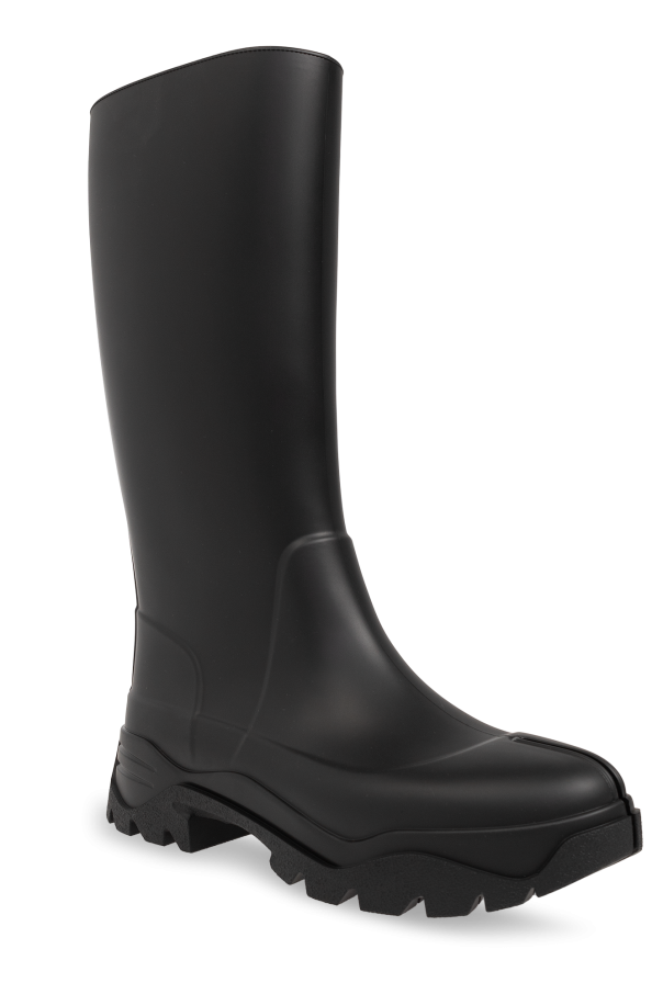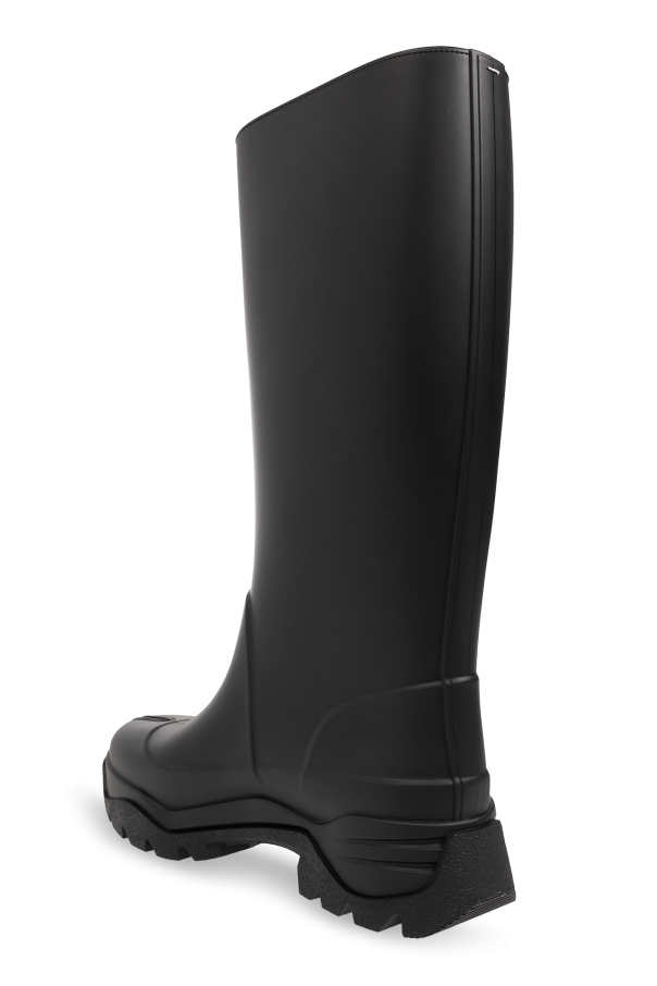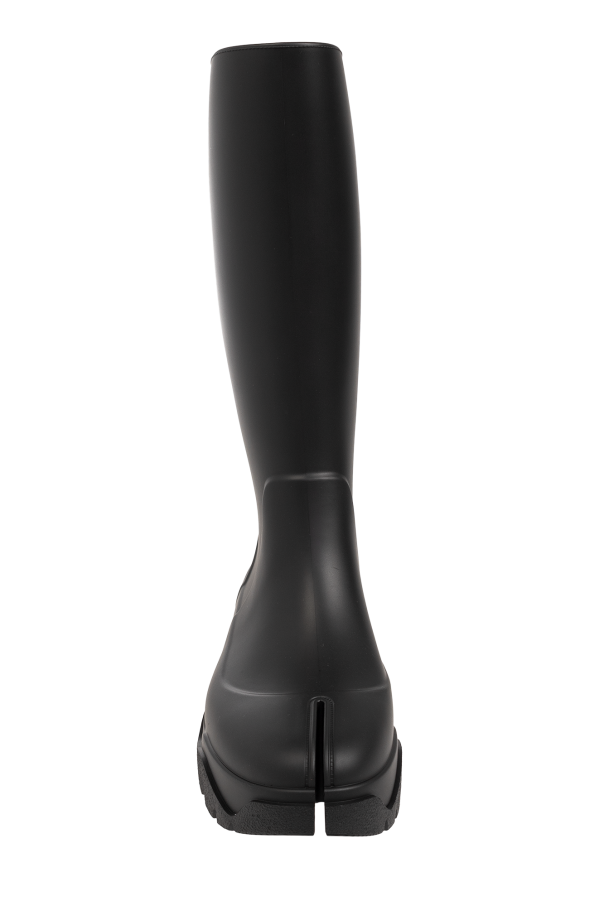 Black rain boots from Maison Margiela. This pair sits on a black rubber sole and features the brand’s signature Tabi toe and a wide upper.