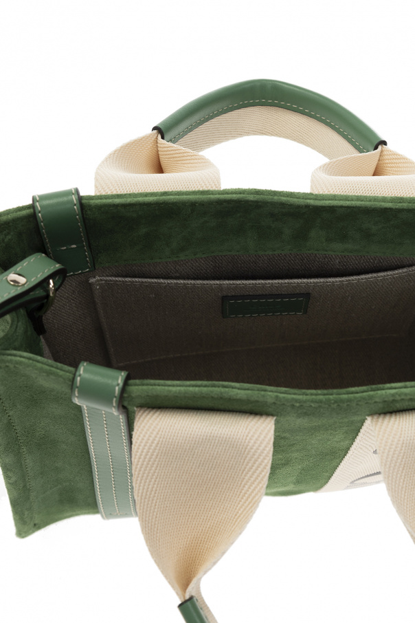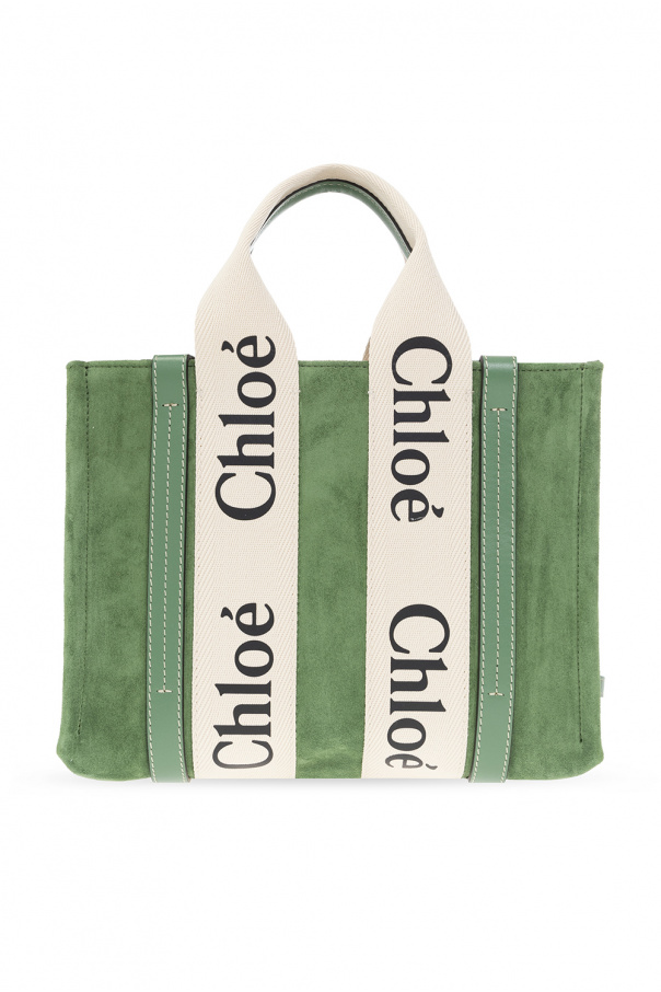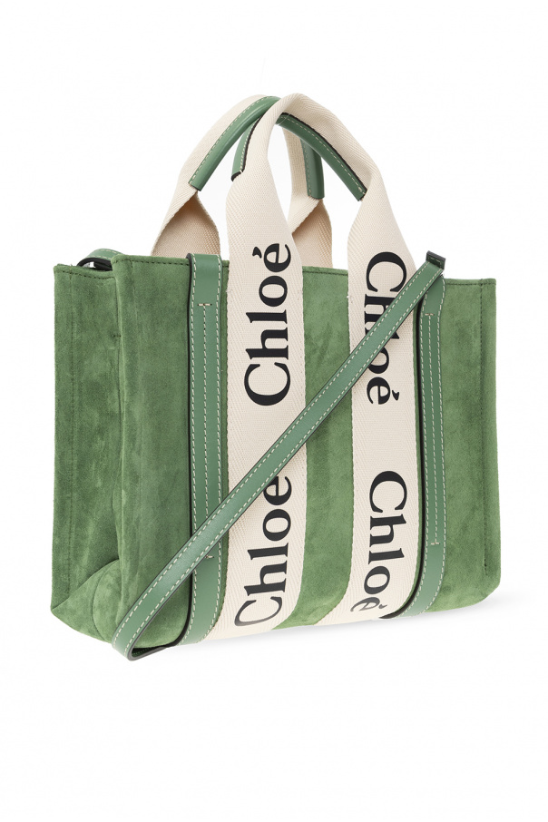 Green and cream ‘Woody Small’ shoulder bag from Chloé. Made of calf suede, this model features a black logo print, two half-round handles, detachable and adjustable strap as well as one internal compartment with one slip pocket.