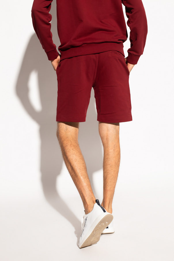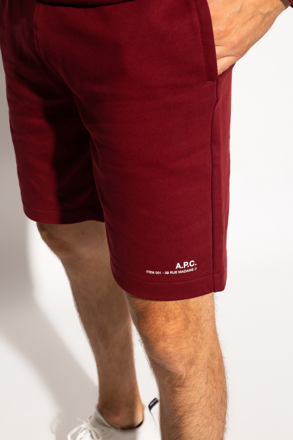 Maroon sweat shorts from A.P.C. Made of cotton, this short sleeve design features wide legs, an elastic waistband with drawstrings, a printed logo pattern in white and three slip pockets.