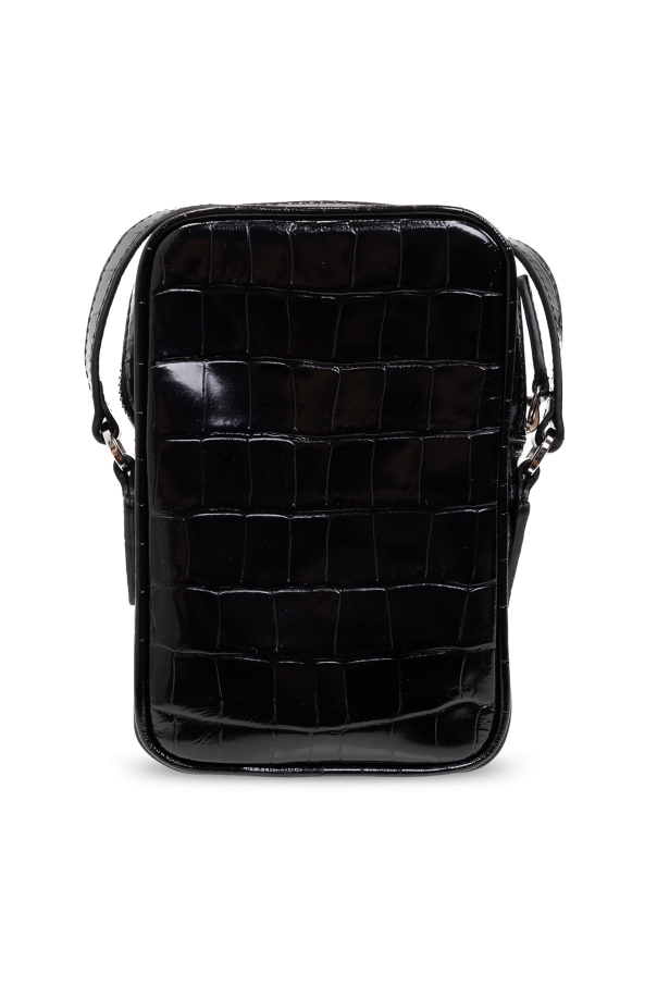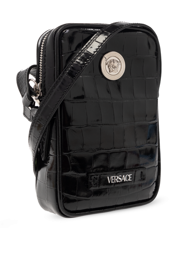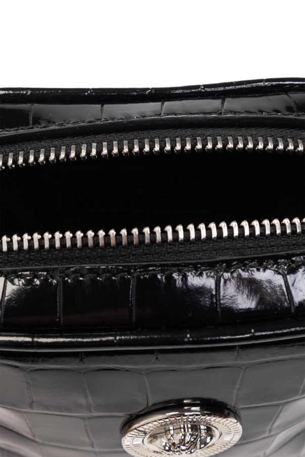 Black shoulder bag from Versace. Made of calf leather with a crocodile skin effect, this design fastens with a zip and showcases the brand\'s signature Medusa face emblem on the front. It is complete with an adjustable shoulder strap, silver-tone metal hardware and one internal compartment.