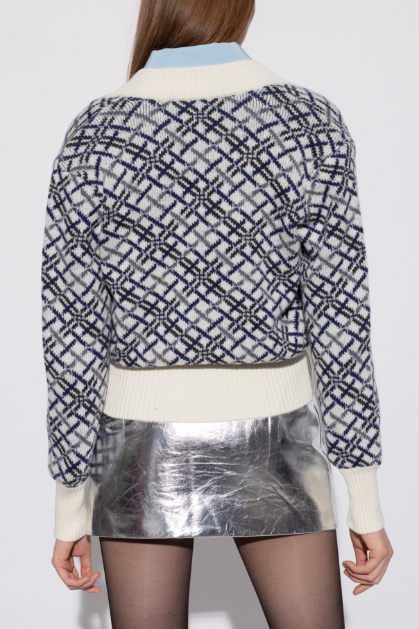 Cream cardigan from Saint Laurent. Made of wool, this style showcases a blue, grey and light purple check pattern, button fastenings, a slip pocket, padded shoulders and ribbed edges.