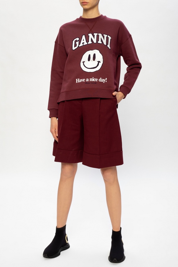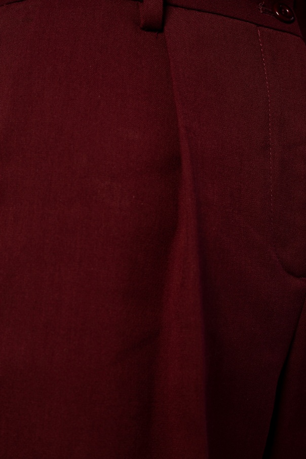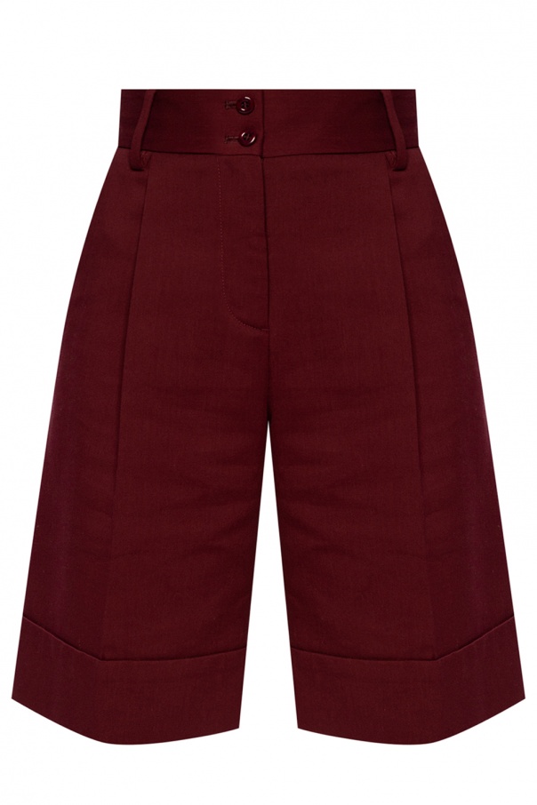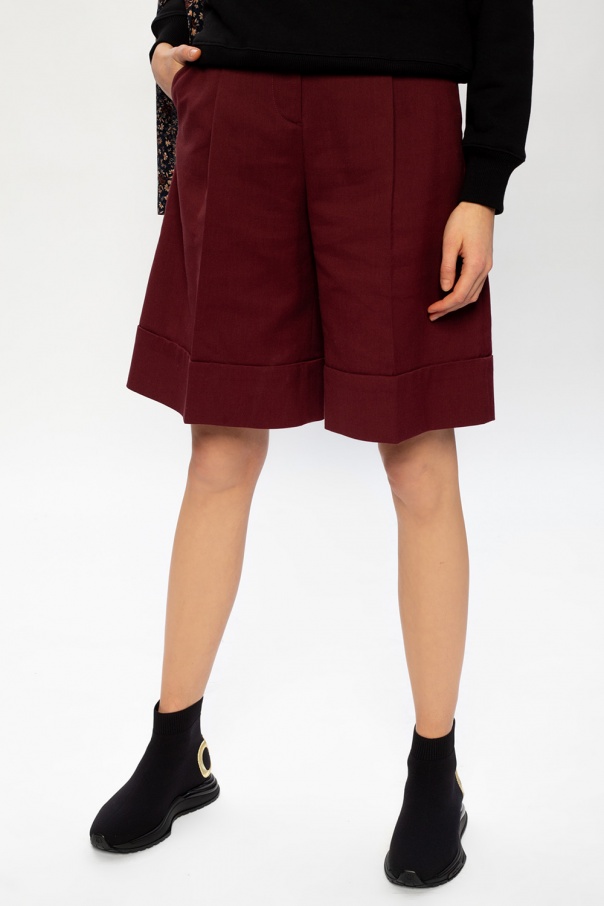 Maroon pleat-front shorts from See By Chloé. Flaunting turn-up cuffs, this pair is complete with a zip fly, a button fastening, two slant front pockets and two buttoned back pockets.