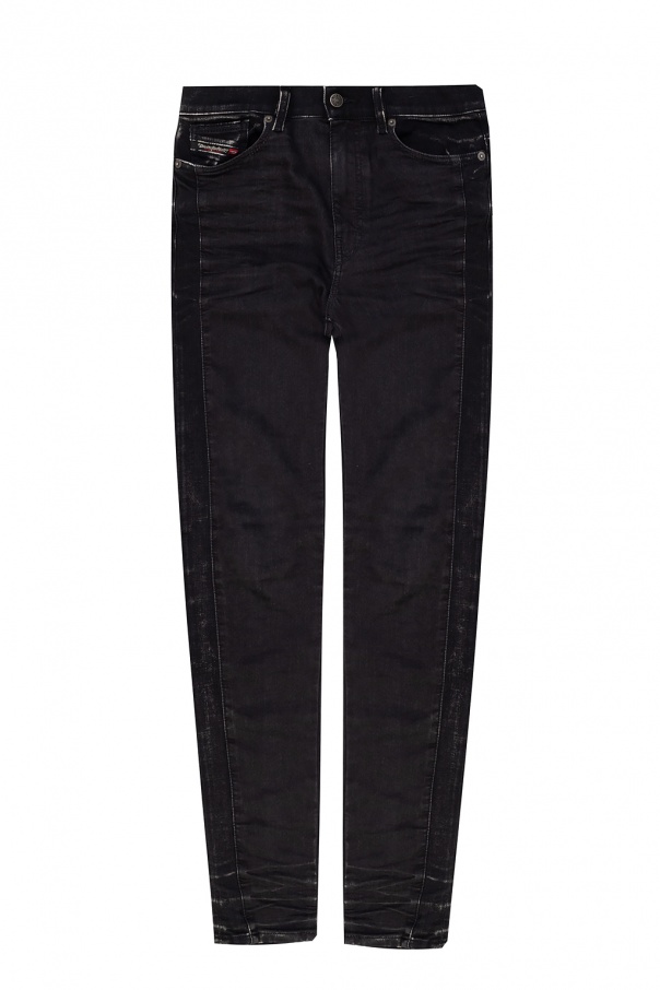 Black ‘D-Reeft Jogg’ distressed jeans with logo from Diesel. This straight leg design features zip and button fastening, logo details, gathers, three front pockets and two back pockets.