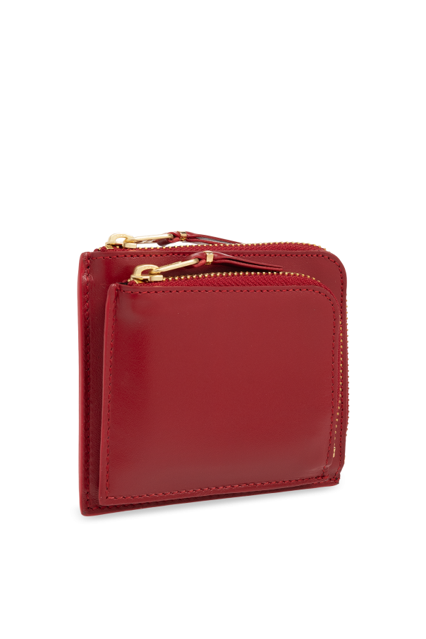 Red wallet from Comme des Garcons. Made of leather, this design features a zip pocket on the front, gold-tone metal hardware and one internal compartment with a card slot.
