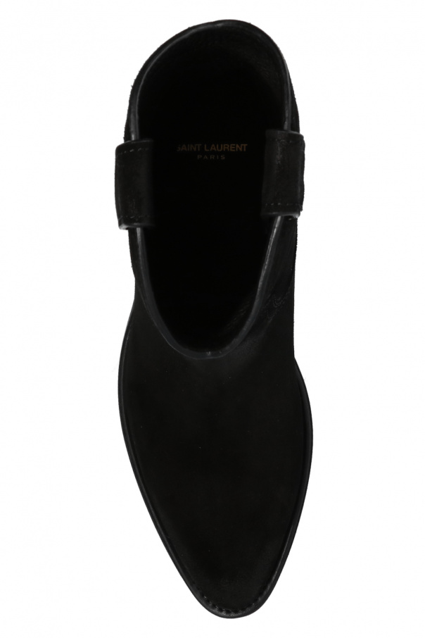 Black ‘Eastwood’ heeled cowboy boots from Saint Laurent. Crafted from suede, this model sits on a black leather sole and showcases a pointed toe silhouette and distinctive stitching.