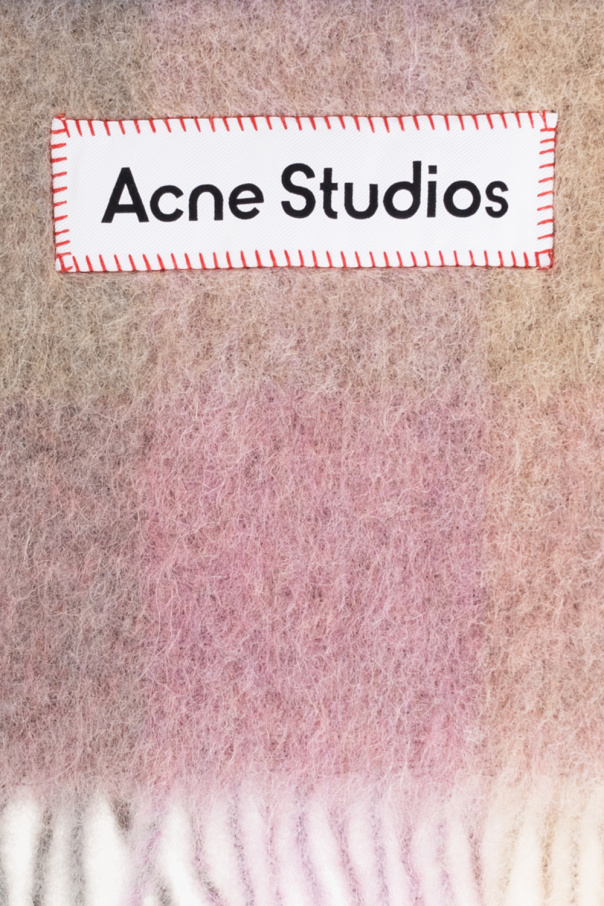 Multicoloured scarf from Acne Studios. Crafted from a wool, mohair and alpaca wool blend, this item showcases a check pattern accompanied by a white logo patch and fringes on shorter ends.