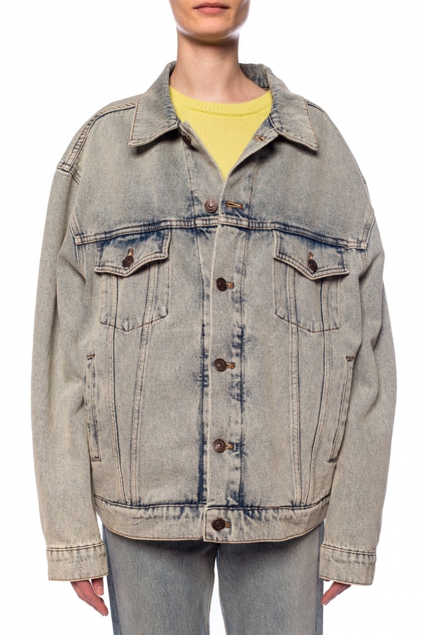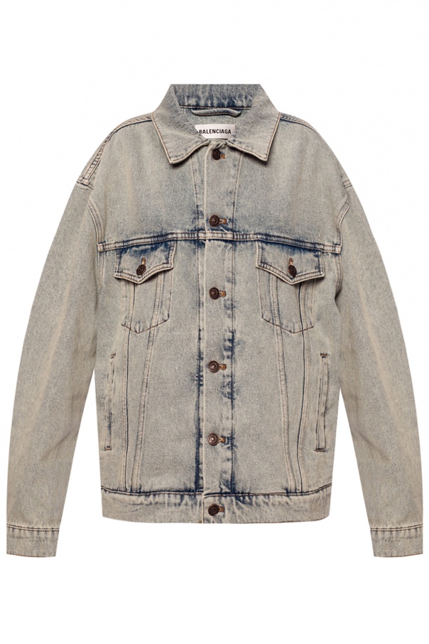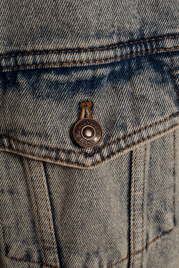 Light blue denim jacket from Balenciaga. Button fastening. Yellow logo embroidered on the back. Long sleeves. 2 slip pockets and 2 buttoned flap pockets on the front.