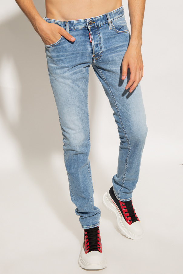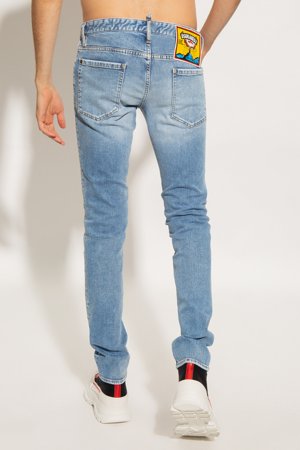 Light blue ‘Slim’ distressed jeans from Dsquared2. Fastened with buttons, this tapered leg design features logo patches and five slip pockets.