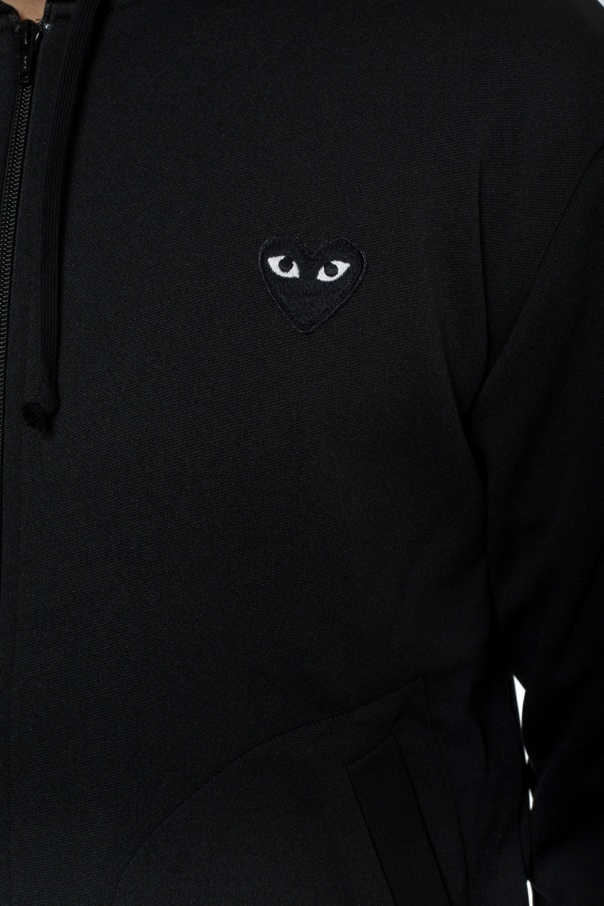 Black hoodie from Comme des Garçons Play. Hood pulled with straps. Fastened with a zip. On the front a sewn on application including a heart motif characteristic for the brand in black and white, as well as two inset pockets. On the back a printed pattern. Bottom and sleeves finished with welts.