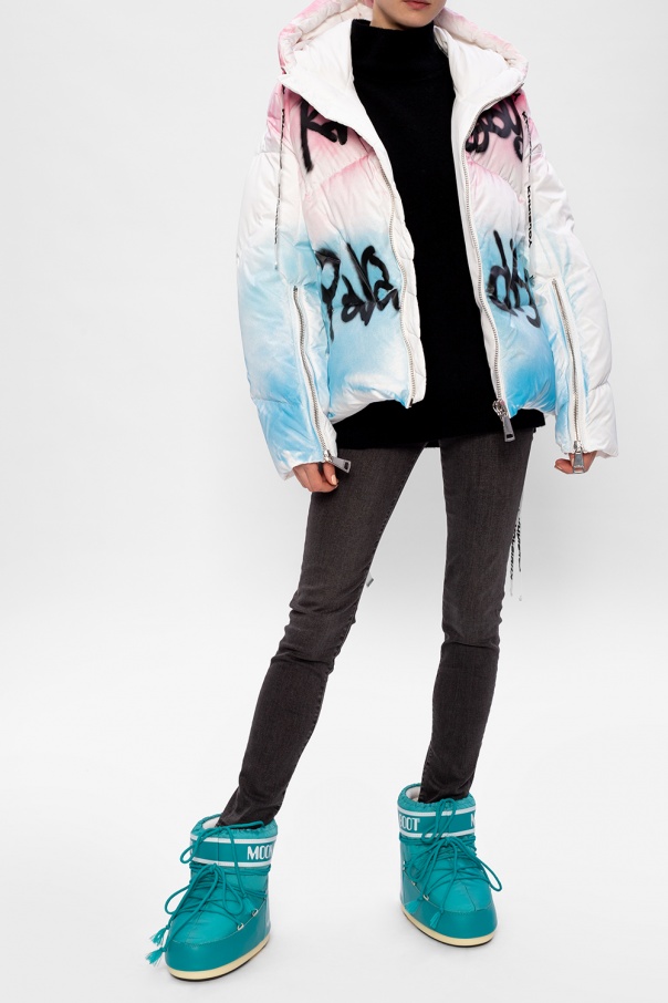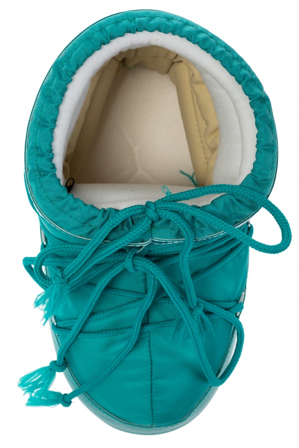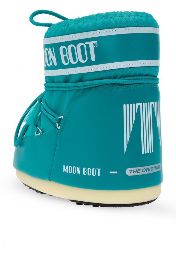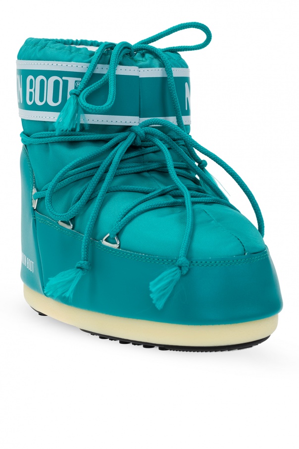 Green and blue ‘Classic Low 2’ snow boots from Moon Boot. Crafted from faux leather, this lace-up design is complete with a logo print, silver-tone metal hardware and a rubber sole in beige and black. Inspired by the peculiar shape and technology of the astronauts' boots, the iconic style was designed in 1969 after the first Moon landing.