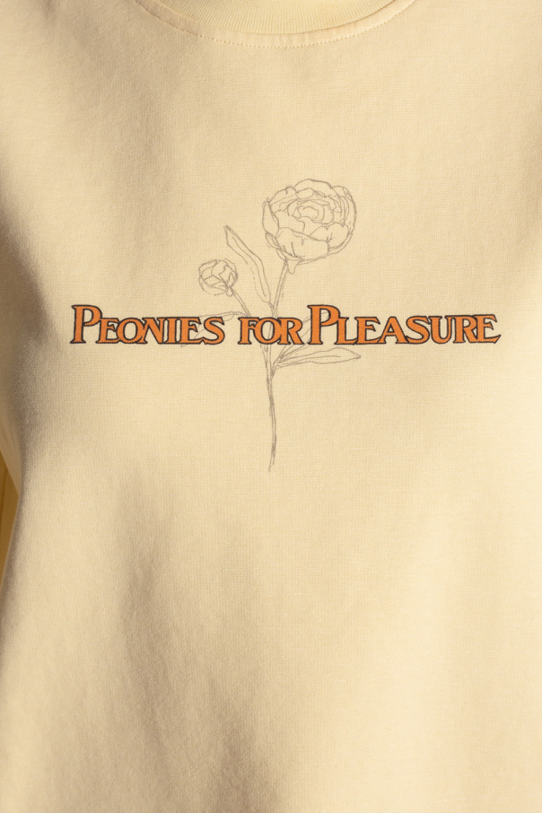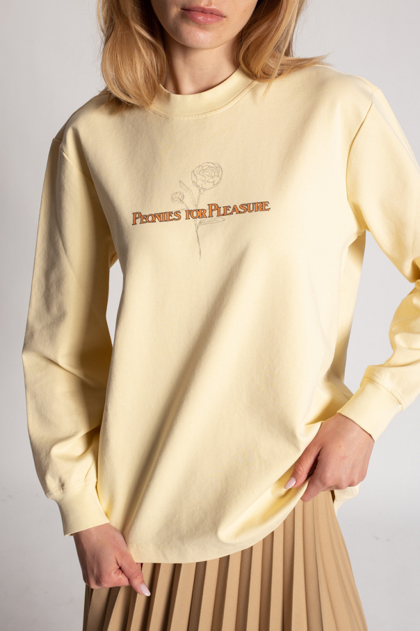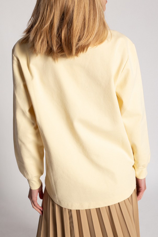 Yellow crewneck T-shirt from Holzweiler. Crafted from organic cotton, this style features long sleeves, rib detailing on the collar, an orange, grey and black graphic print with the brand\'s logo on the front and a black logo detail on the back.