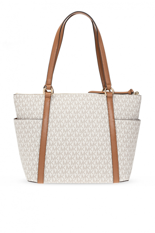 Cream and brown ‘Sullivan’ shoulder bag from Michael Michael Kors. Crafted from monogrammed canvas and leather, this design fastens via a zip and features gold-tone metal hardware, including a logo plaque on the front, slip pockets on the sides, two half-round straps and one internal compartment with several pockets to store all your valuables.