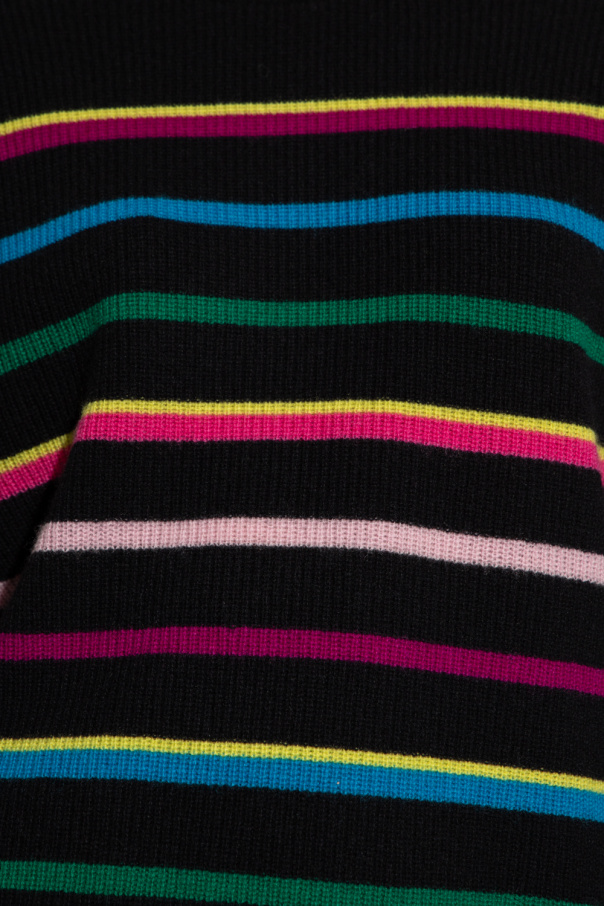 Black sweater with a round neck and long sleeves from Kate Spade. Crafted from cashmere, this design is enriched by a multicolored stripe pattern and ribbed edges.