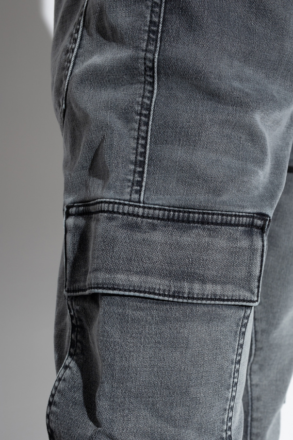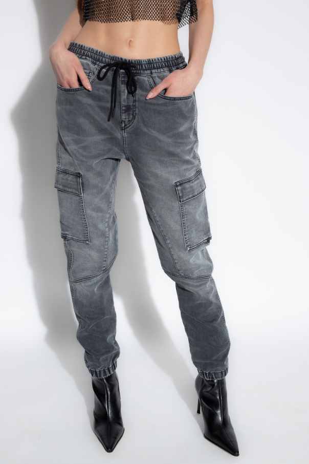 Grey ‘2051 D-URSY’ jogger jeans from Diesel. Enriched by distressed details, this pair features a drawstring waistband, four slip pockets, two flapped pockets and elasticated cuffs.