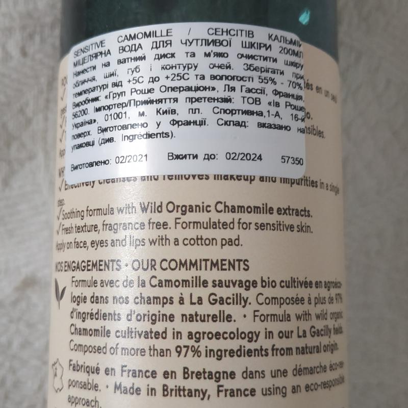 Sensetive Camomille мицеллярная вода для чувствительной кожи Yves Rocher. Вода брежно смягчает и ухаживает за чувствительной кожей лица. В составе 97% натуральных ингредиентов, содержит органический экстракт дикой ромашки. Текстура свежая, без отдушки. Подходит для ухода за кожей губ, век и лица. Вода новая, срок указан на упаковке до 04/2024г. Производство Франция.