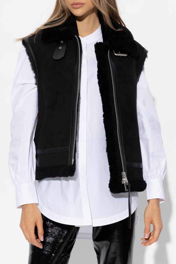 Black ‘Tova’ vest from AllSaints. Crafted from sheep leather and lamb fur trims, this design is complete with a two-way zip, fur collar with a buckle strap, two slip pockets and adjustable strap at the hem.