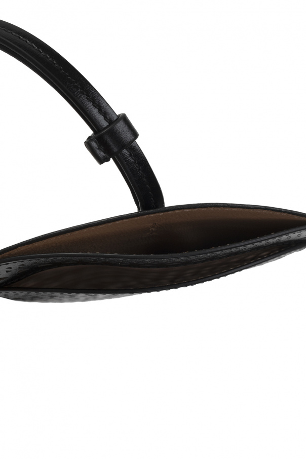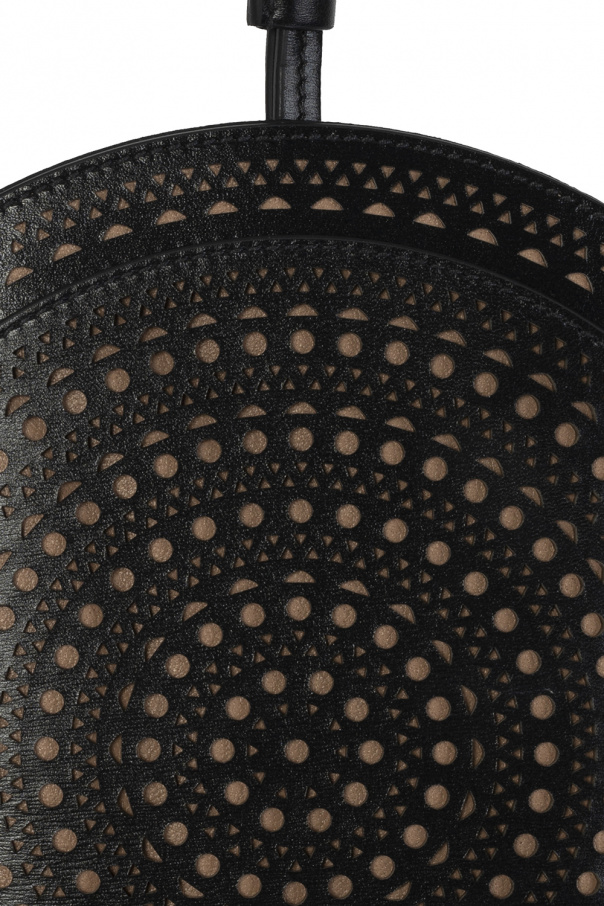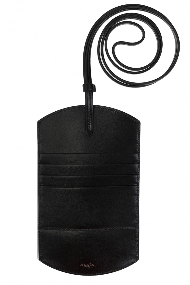 Black and beige phone holder from Alaia. Crafted from leather accentuated with a laser-cut ‘Micro Vienne’ motif, this design features a slip pocket, four card slots accompanied by a silver-tone logo on the back, a neck strap and one internal compartment.