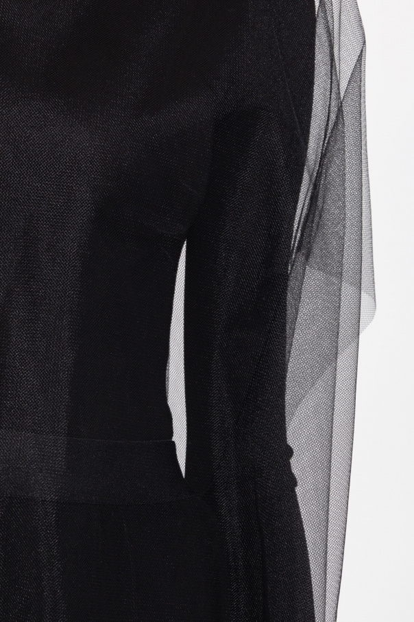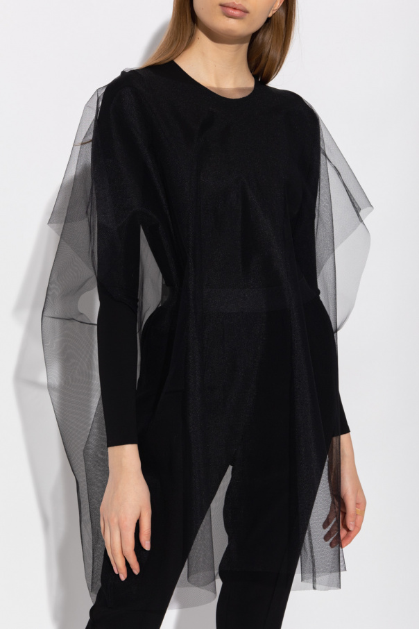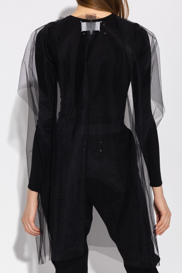 Transparent, black top from Maison Margiela. Made of stiff tulle, this short sleeve design features raw-cut edges at the neck and cuffs.