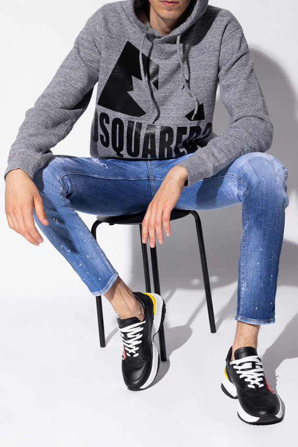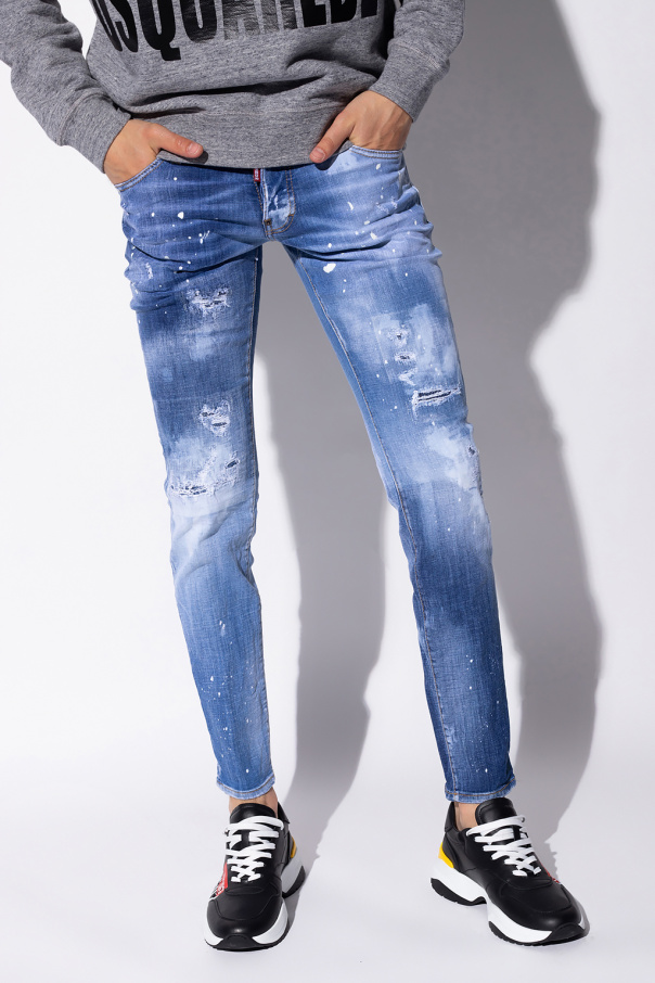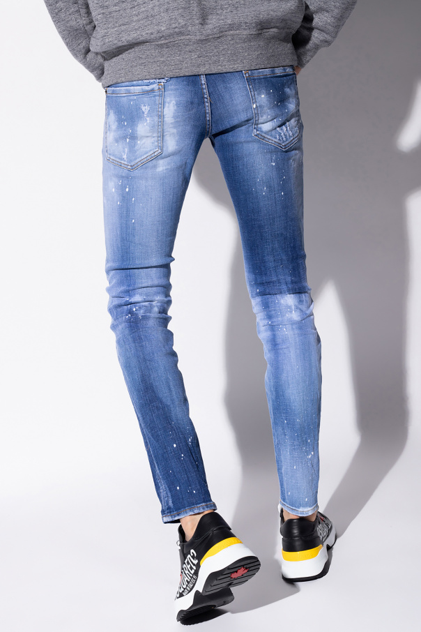 Blue ‘Slim’ jeans from Dsquared2. Fastened with buttons, this pair falls down with tapered legs and features yellow stitching details, a white paint splatter effect, cream patch printed with a black logo, three front pockets, two back pockets and raw trims.