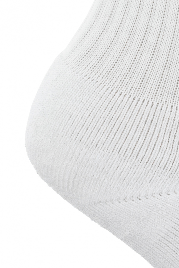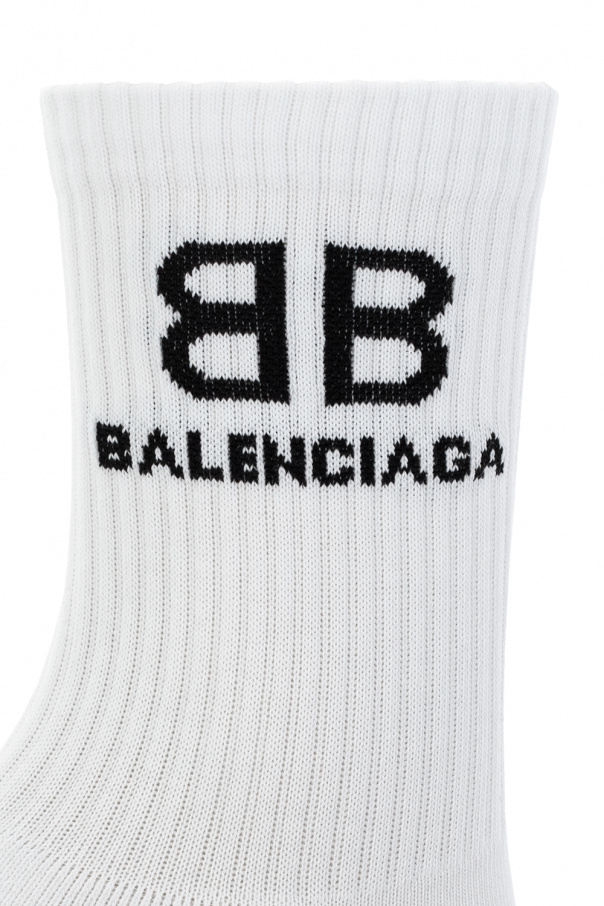 White socks from Balenciaga. Made of cotton, this pair features a black logo embroidery and ribbed cuffs.