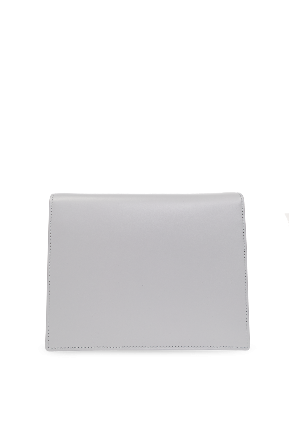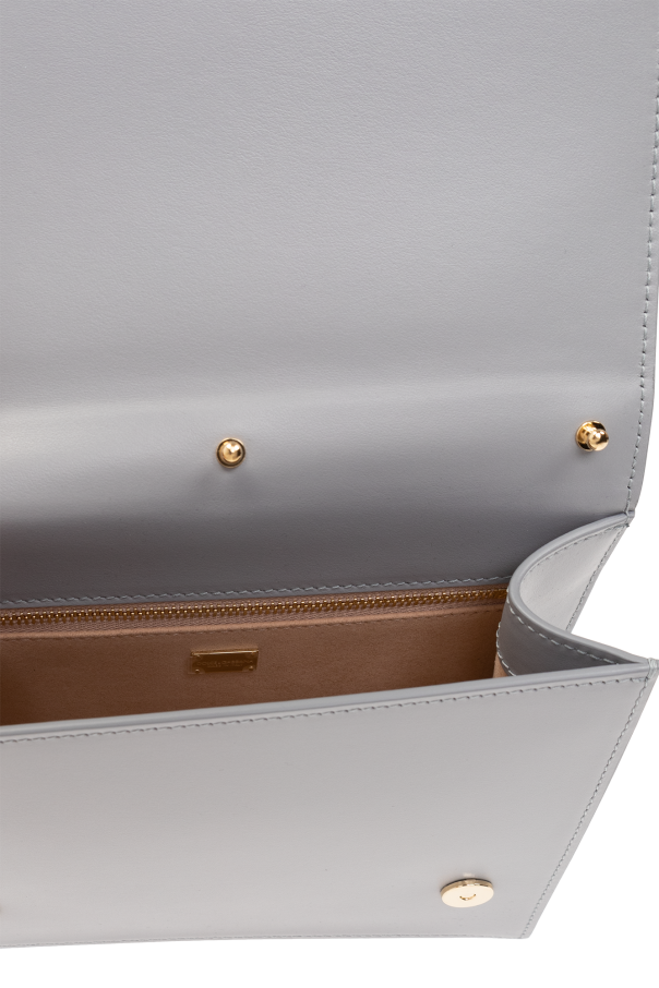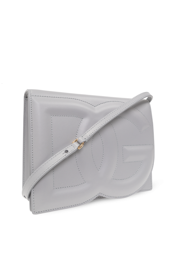 Grey shoulder bag from Dolce & Gabbana. Crafted from patent calf leather, this design features a snap closure, raised logo, detachable and adjustable shoulder strap, gold-tone metal hardware and one internal compartment with one snap-fastened pocket and one zip pocket.