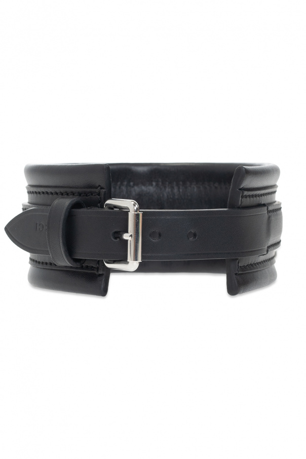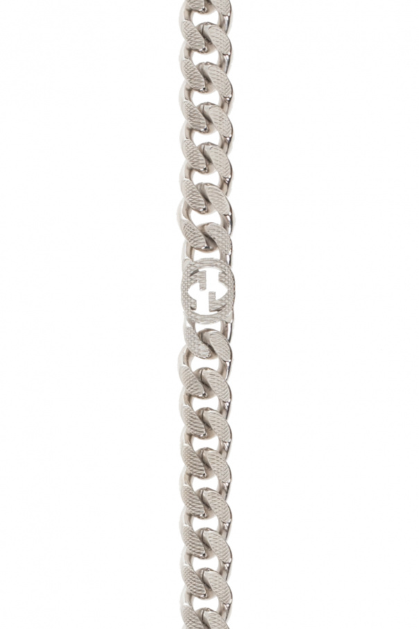 Black necklace with a harness from Gucci. Made of calf leather, this model features a chain with a snap hook at the waist, leather necklace and silver-tone metal hardware.