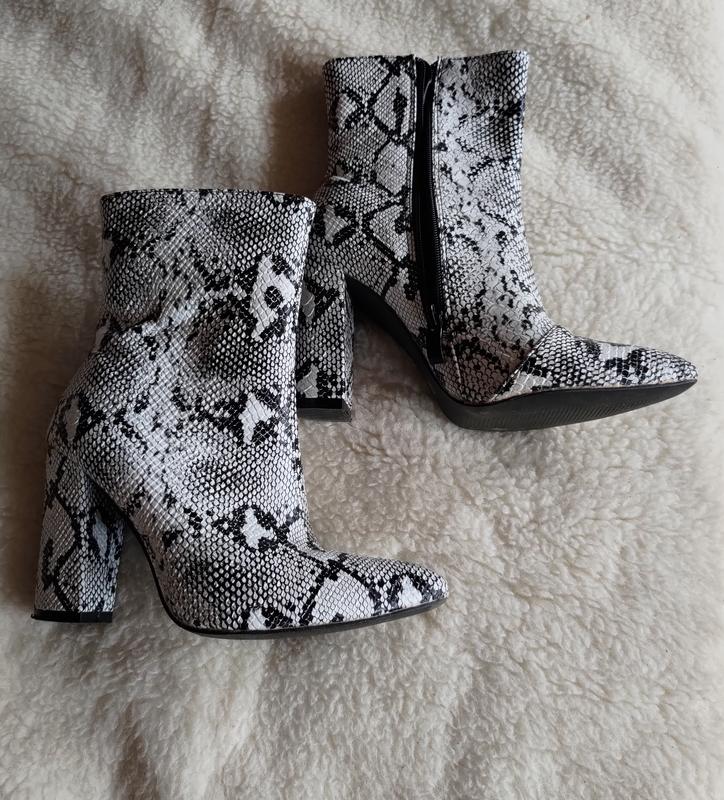 ботильоны на каблуке. животный принт змеи. на каблуке. высота каблуков 10 см. каблуки постояничны. носок заужен. экокожа. застегиваются на замок. одеты один раз. размер 37. в идеальном состоянии.