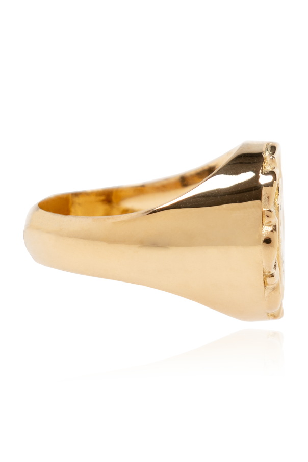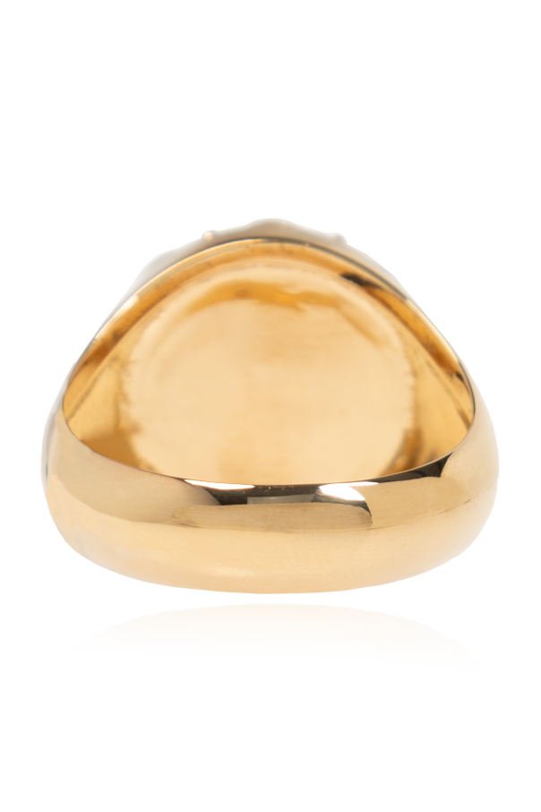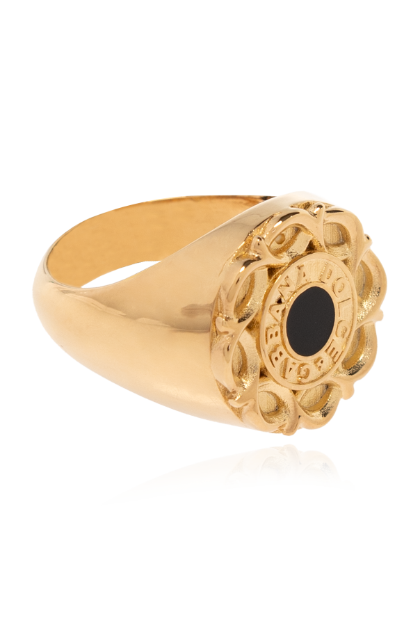 Introducing the Dolce & Gabbana Signet Ring, a paragon of luxury and sophistication. This exquisite accessory features a traditional, robust shape with a wide band that gracefully tapers downwards, embodying timeless elegance. Crafted from gold, the signet ring radiates opulence, enhanced by intricate relief designs reminiscent of intricate braids or botanical motifs. The centerpiece boasts a striking black stone encircled by the distinguished Dolce & Gabbana logo, accentuating the ring’s iconic heritage. The dominant golden hue and the meticulously engraved logo around the central stone make this piece an unmistakable symbol of refined taste. Styled elegantly on the hand, this signet ring is perfect for special occasions or as a statement piece in a luxurious ensemble. Why Choose This Product? Exquisite craftsmanship from Dolce & Gabbana Luxurious gold material Intricate relief designs and elegant detailing Iconic logo engraving highlighting brand prestige Perfect for special occasions or as a luxury accessory
