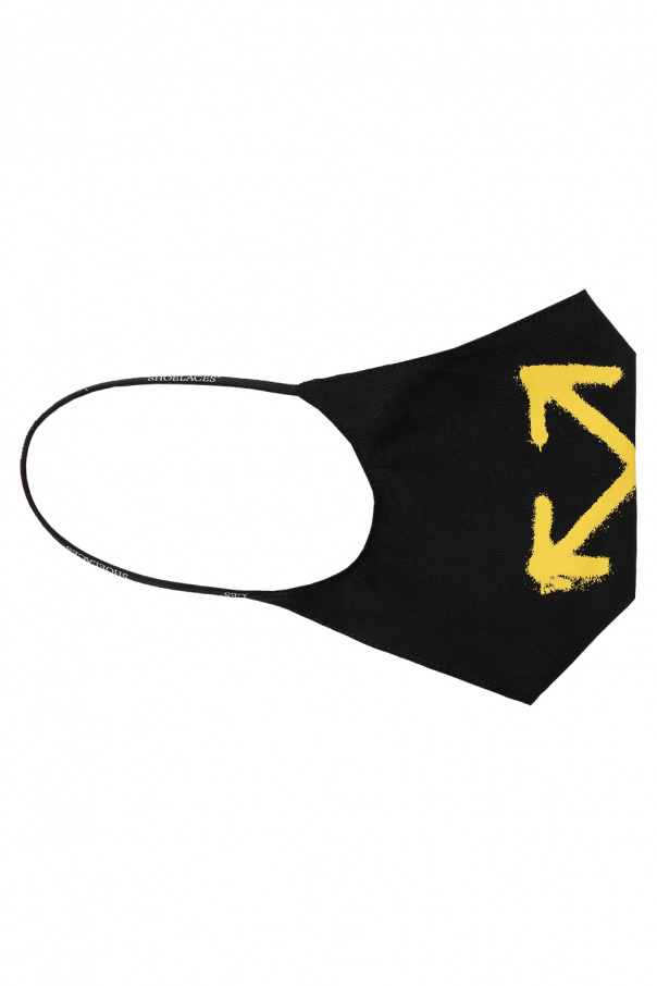Black face mask from Off-White. Crafted from cotton, this item showcases a yellow graphic print with the brand\'s logo.