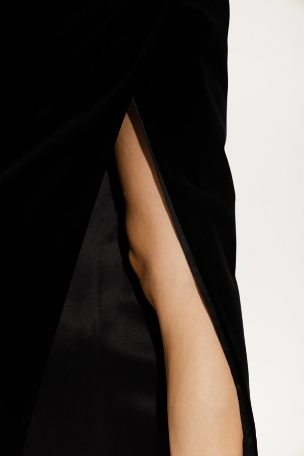 Black skirt from Saint Laurent. Made of velvet, this garment features button and zip fastening, two front pockets, two buttoned back pockets and double rear vent.