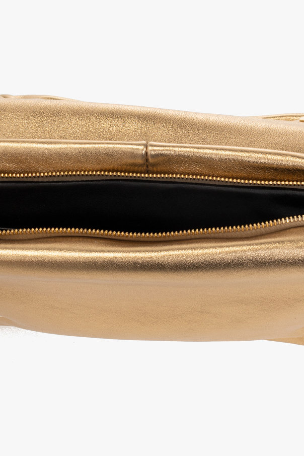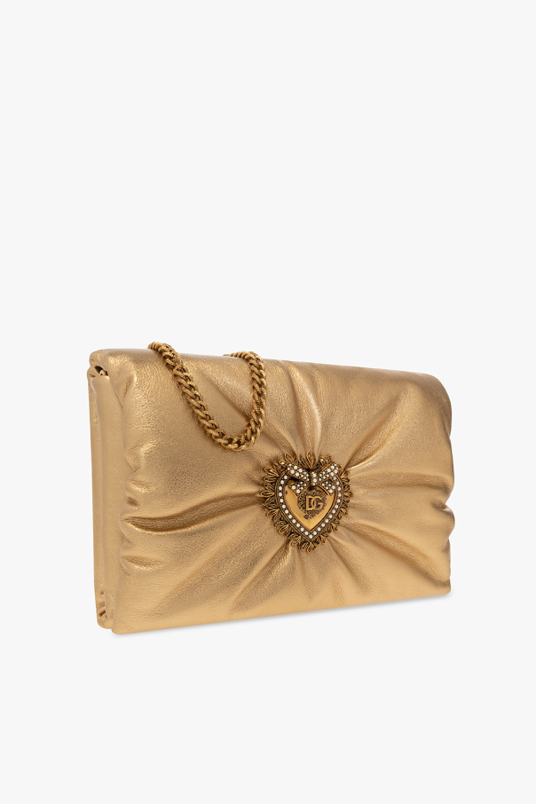 Gold-tone ‘Devotion Medium’ shoulder bag from Dolce & Gabbana. Crafted from lamb leather with a metallic finish, this design secures with snaps and showcases branded heart-shaped hardware with pearly details, a detachable chain and leather shoulder strap, gold-tone metal elements and one internal compartment with one zip pocket and one slip pocket.